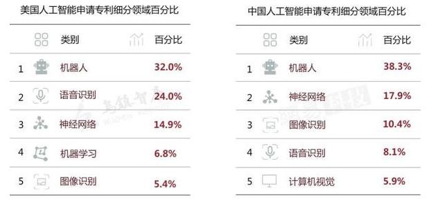 随着全球科技巨头陆续开放人工智能平台,据报告称,美国,英国和中国将成为人工智能发展的主力军。从下图来看,美国和中国在人工智能细分领域申请专利数量分布大体相似,其中,机器人、神经网络、语音识别及图像识别占主导地位,也就意味着,人工智能+医疗有非常大的潜在市场。